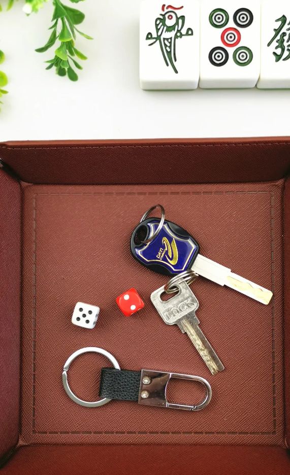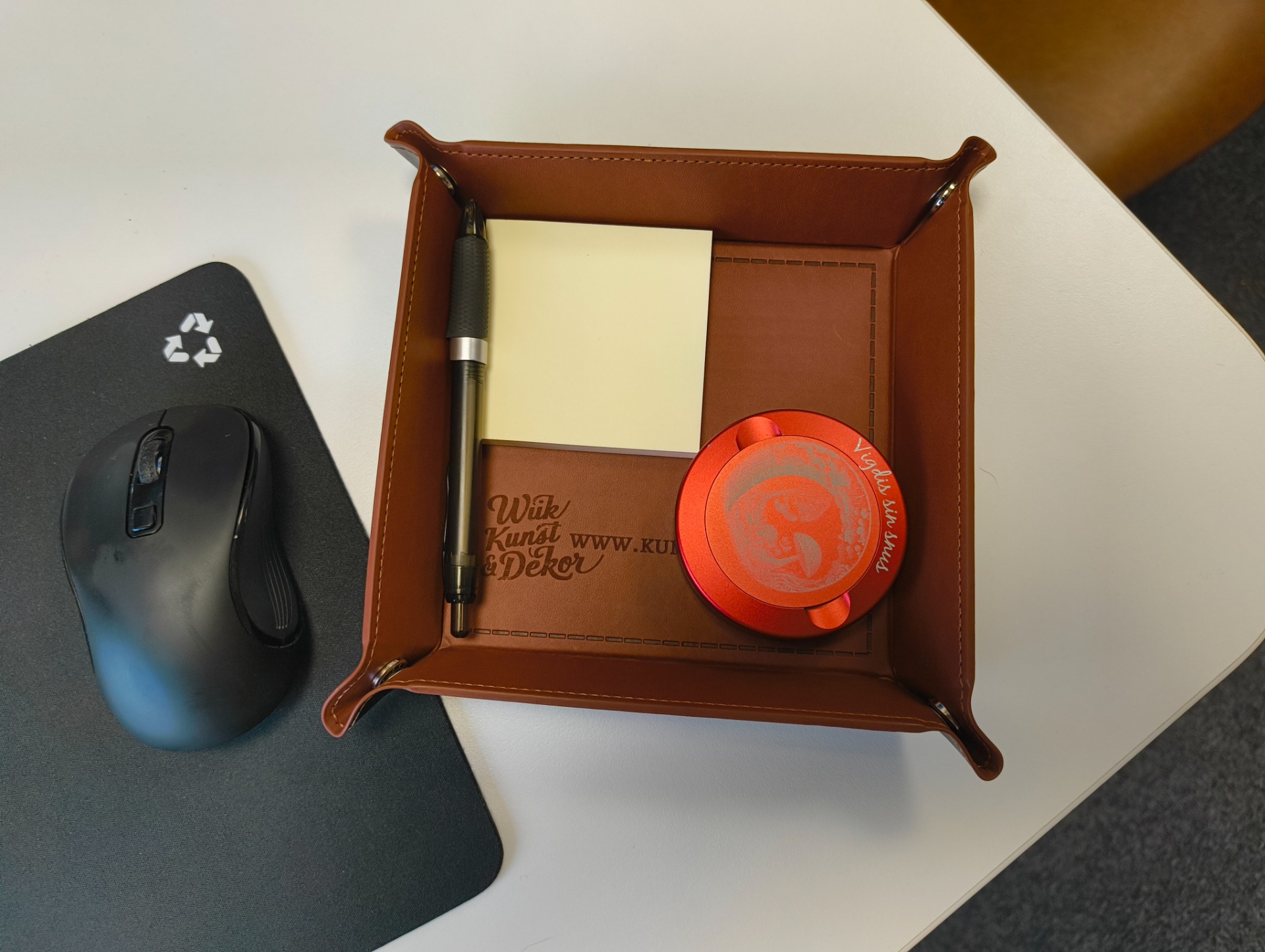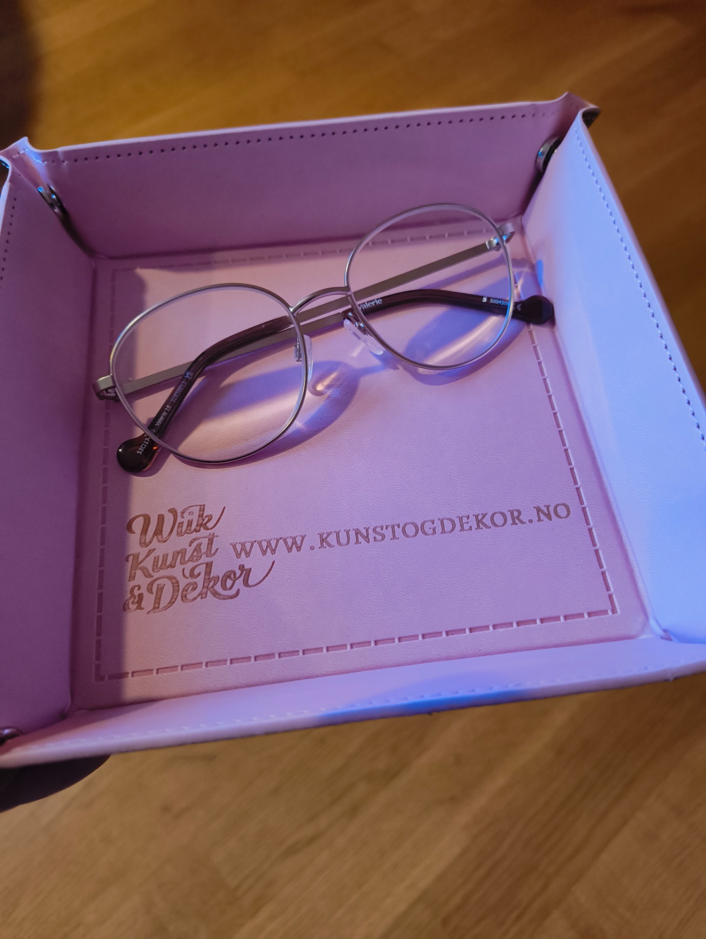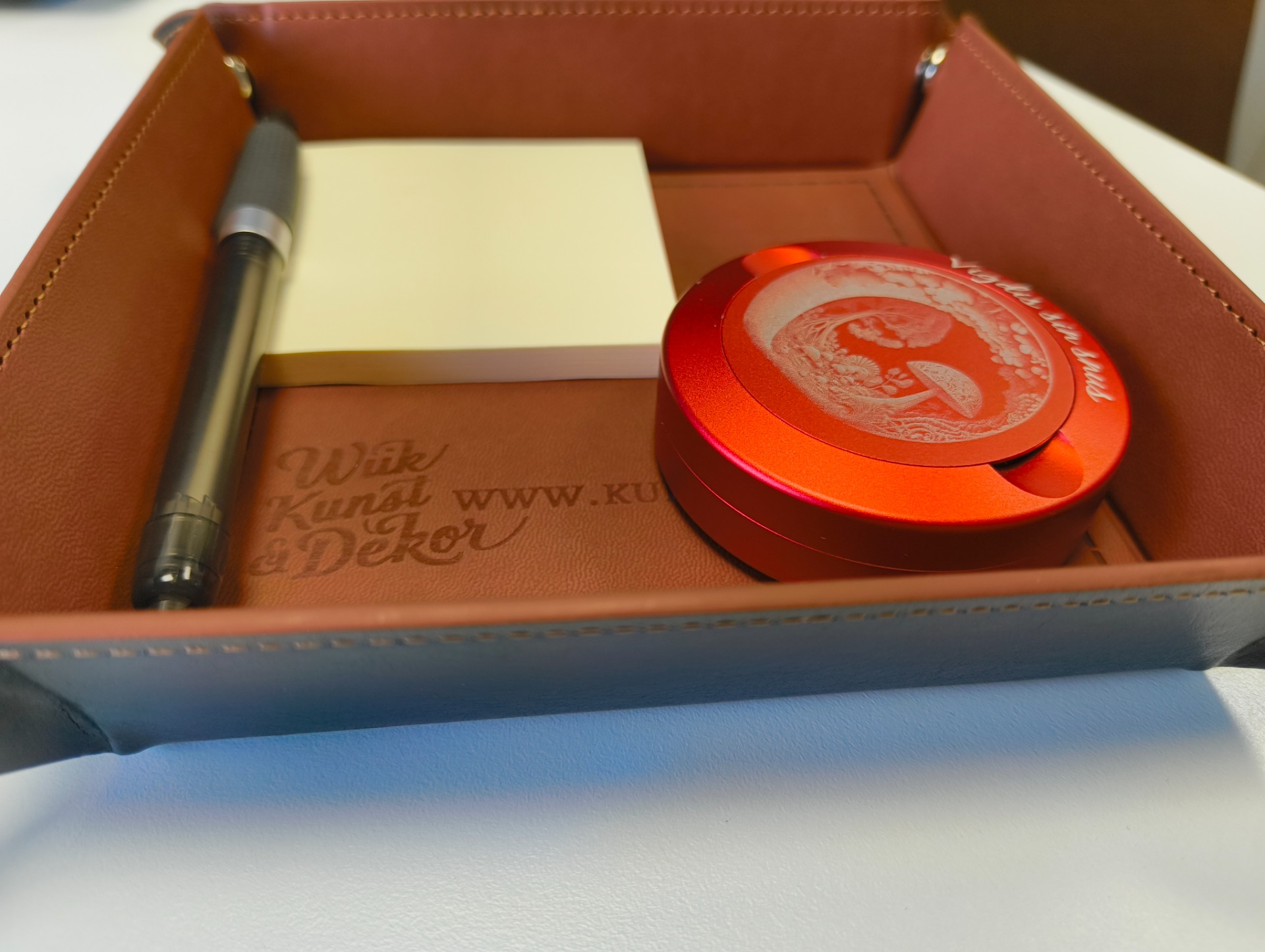 Stilige fat i kunstlær som kan graveres etter ønske. Supre til nøkler og småting, eller til å bruke til terningspill. Fatet er helt flatt, og du "monterer" det med trykknapper i hjørnene. Lett å ta med på tur. Det passer like godt på nattbordet som på badet eller i stua!